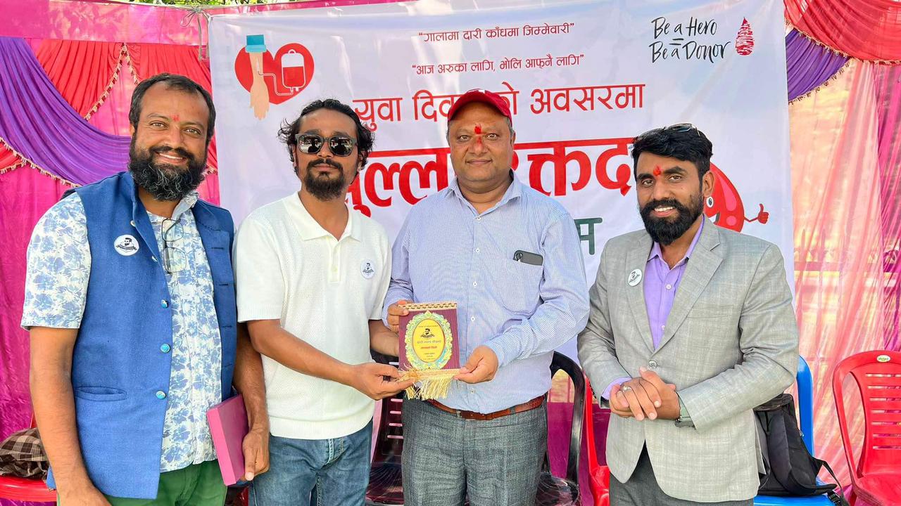 पोखराको केदारेश्वर मन्दिर परिसरमा आयोजित कार्यक्रममा प्रमुख आमन्त्रित व्यक्तित्व एवं संस्थापक अध्यक्ष शेखर गौतमलाई ब्लड ब्याग हस्तान्तरण गर्दै रक्तदान कार्यक्रमको शुभारम्भ भएको संयोजक उज्ज्वल भुजेलले बताए ।