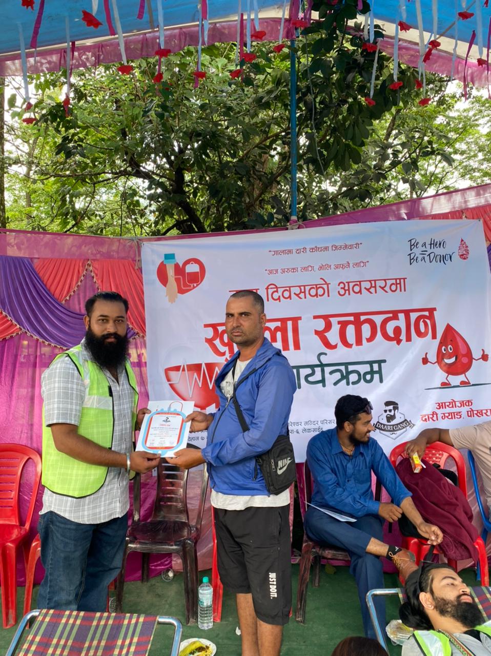 ‘आज अरुका लागि, भोलि आफ्नै लागि’ भन्ने नाराका साथ दाह्री ग्याङ, नेपाल रेडक्रस सोसाइटी, श्रेत्रीय रक्तसञ्चार सेवा केन्द्र कास्कीको सहयोगमा पोखराले यस वर्ष पनि सोमबार रक्तदान कार्यक्रम आयोजना गरेको हो ।