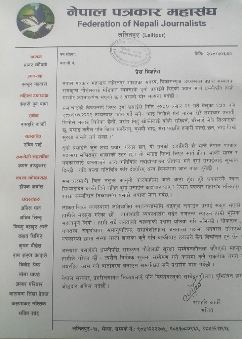 समाचारमाथि चित्त नबुझे कानुनी कारबाहीमा जाने बाटो हुँदा हुँदै पत्रकारकै ज्यान सिध्याइदिने धम्की दिने शक्ति दुर्गा प्रसाईंले कहाँबाट पाए ? भन्दै ललितपुर शाखाले सम्बन्धित निकायसँग यसको जवाफ माग मागेको छ ।