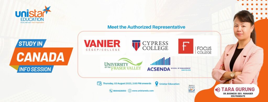 शैक्षिक परामर्शमा विश्वासिलो ठाउँ युनिस्टार एजुकेशनले यही कुरालाई मध्यनजर गर्दै भोलि साउन १८ गते बिहिवार (३ अगस्ट) मा क्यानडा एजुकेशन इन्फोसेसन आयोजना गर्दैछ ।