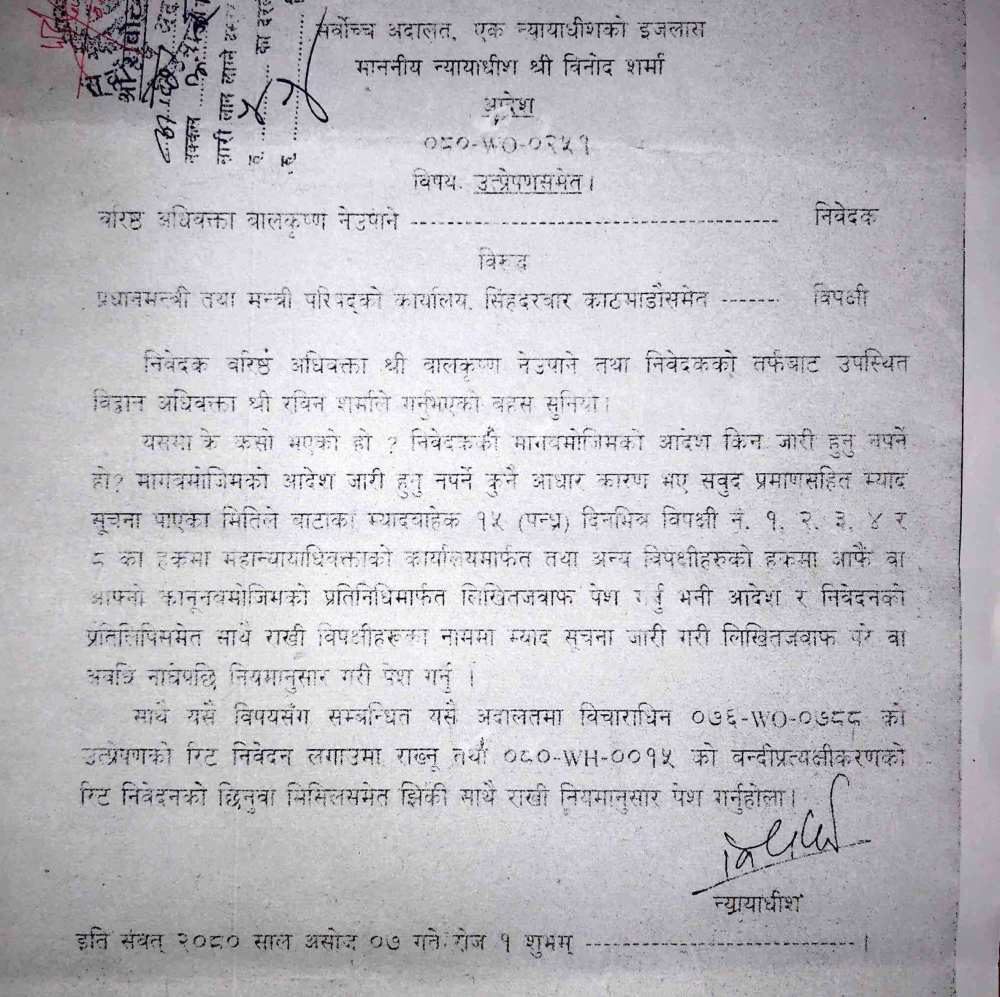न्यायाधीश विनोद शर्माको इजलासले वरिष्ठ अधिवक्ता बालकृष्ण न्यौपाने र अधिवक्ता रविन शर्माको रिट निवेदनमाथिको सुनुवाइ गर्दै सरकारका नाममा कारण देखाउ आदेश जारी गरेको हो।