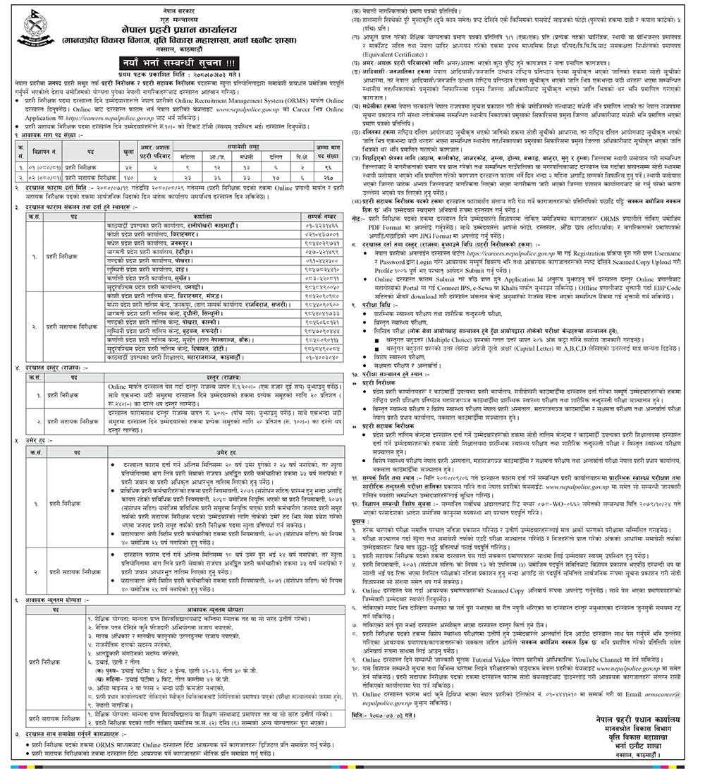 प्रहरी प्रधान कार्यालय नक्सालले निकालेको सूचना अनुसार दरखास्त फारम कात्तिक १९ गतेदेखि आउँदो मंसिर २९ गतेसम्म तोकिएको छ ।