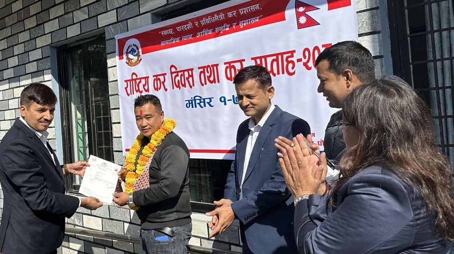 आज पहिलो दिन करदाता नल बहादुर गुरुङलाई पहिलो सेवा लिने करदाताका रूपमा आन्तरिक राजस्व कार्यालय, पोखराले सम्मान गरेको छ।