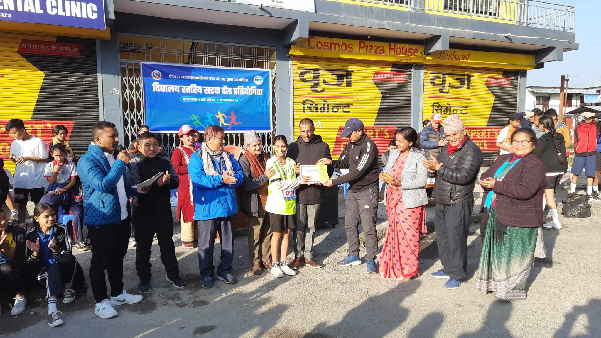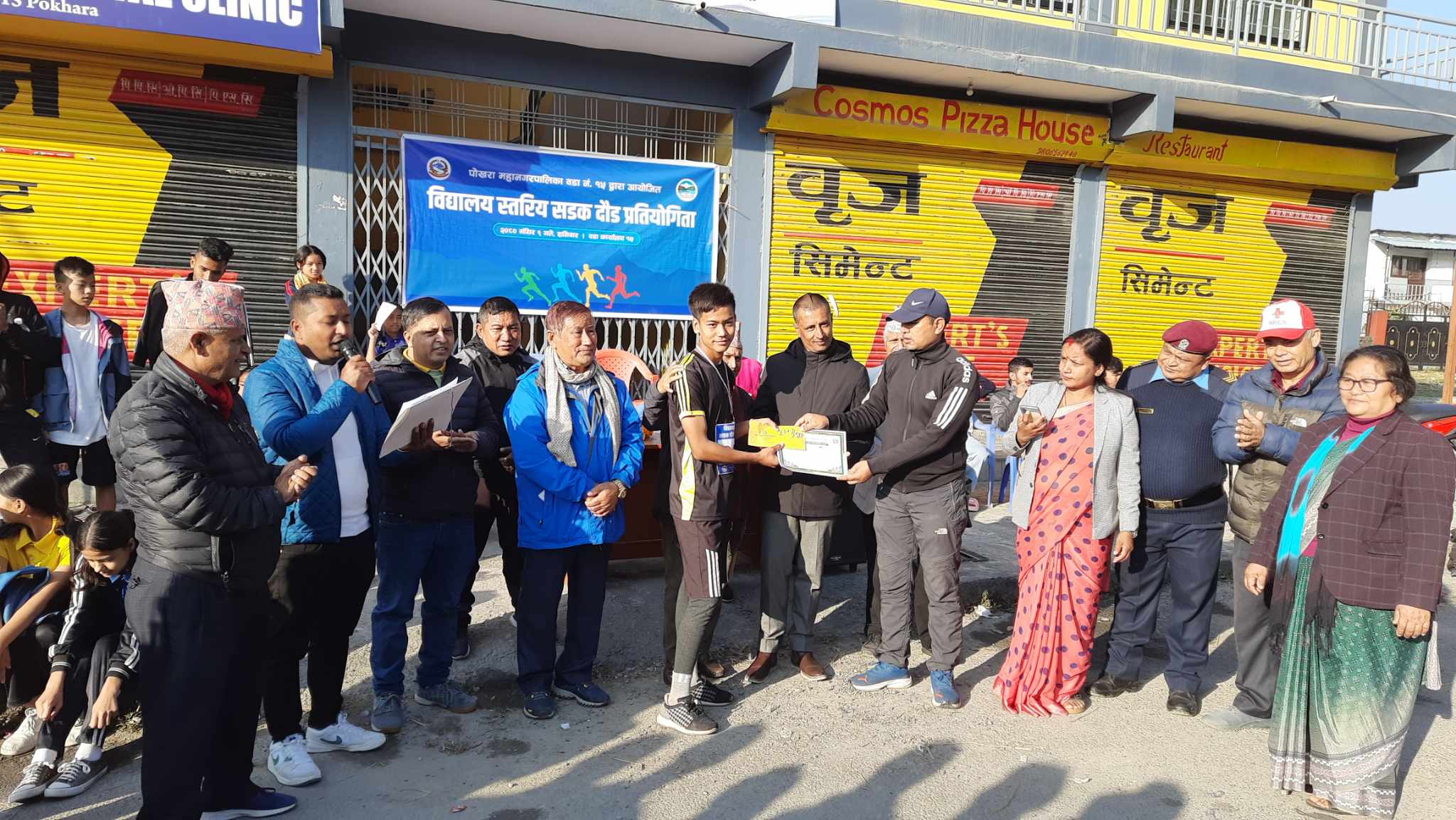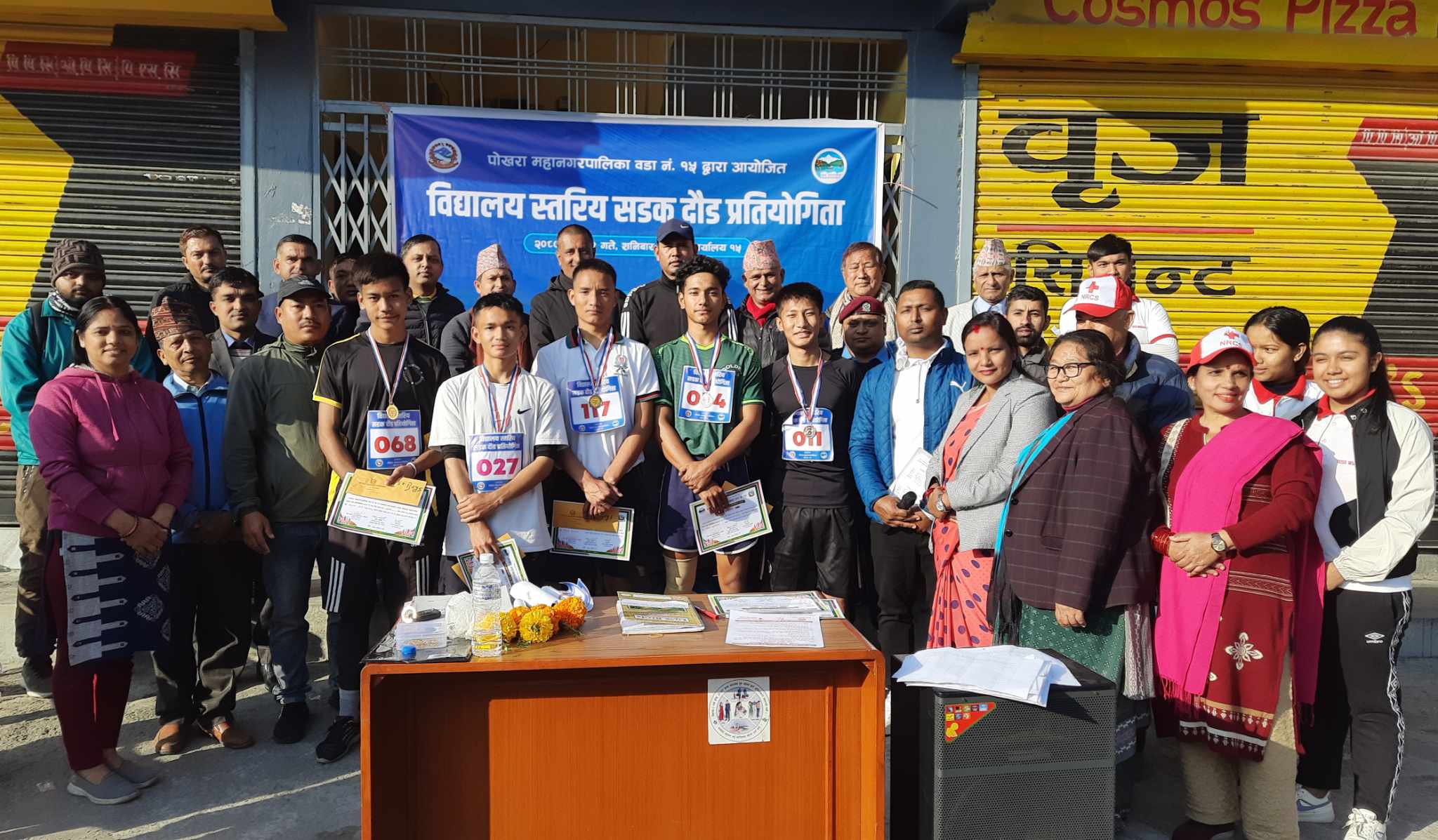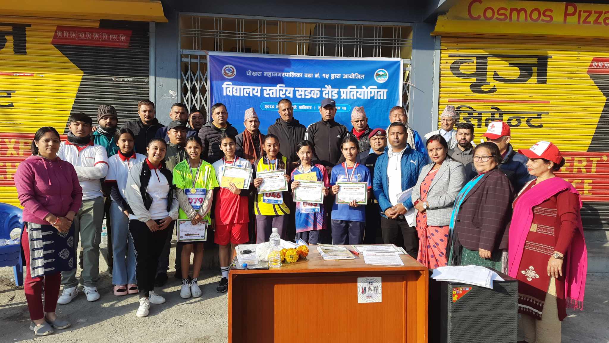 पोखरा महानगरपालिका वडा नंं. १५ कार्यालयले शनिबार आयोजना गरेको अन्तर विद्यालय सडक दौड प्रतियोगितामा छात्रतर्फ शुभतारा थ्री एन्जल्सका प्रकाश डाँगी र छात्रातर्फ भ्यू पोइन्ट स्कूलकी सजिना सुनार प्रथम भएकी छन् ।
