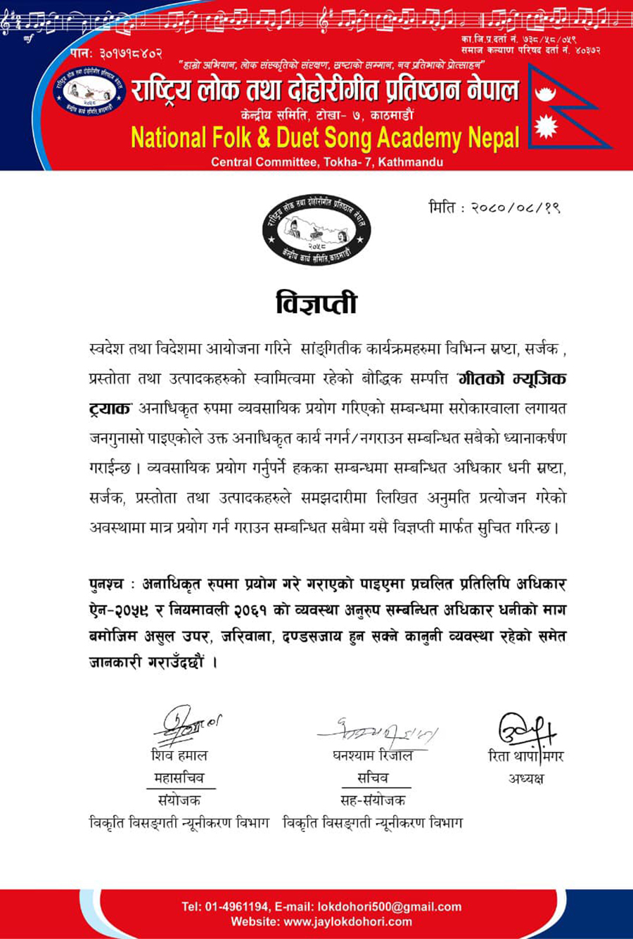 प्रतिष्ठानले मंगलबार विज्ञप्ति जारी गर्दै गीतको धनी, सर्जक तथा प्रस्तोता, उत्पादनको समझदारीमा लिखित अनुमति प्रत्यायोजन गरेको खण्डमा मात्र प्रयोग गर्न आग्रह गरेको छ ।