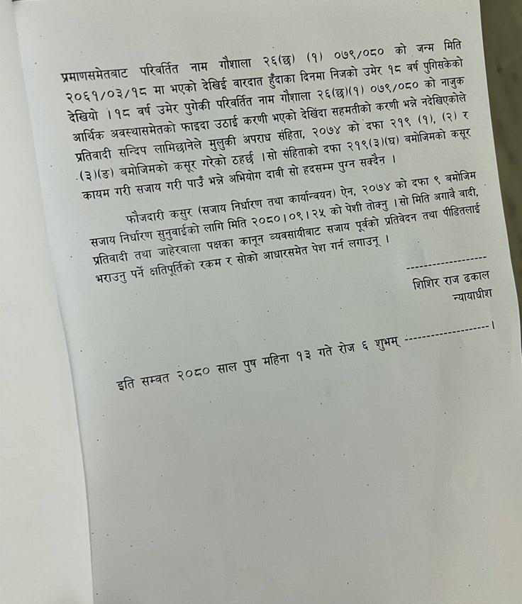 शुक्रबार सो मुद्दामा न्यायाधीश ढकालको इजलासमा पीडित र पीडक दुवैतर्फका वकिलहरुले बहस सकेपछि दोषी ठहर गरेको हो ।