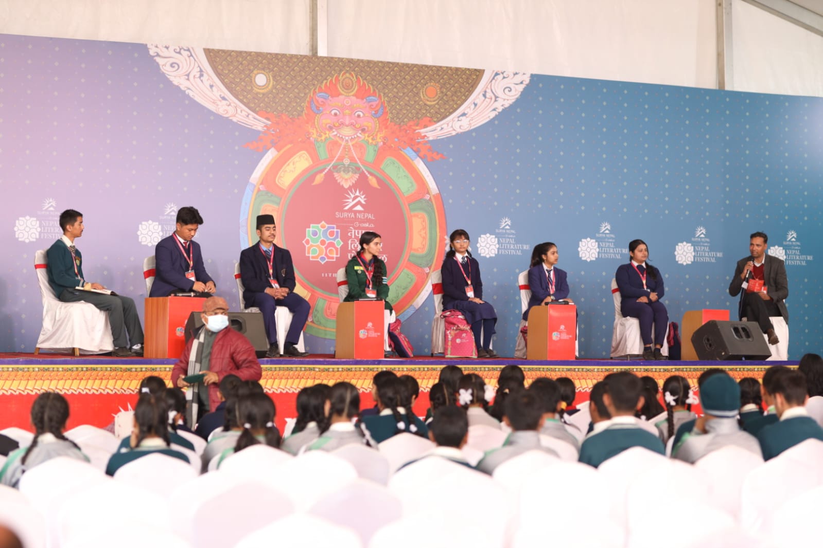 ‘पढेको पुस्तक र प्रभाव’ विषयको सेसनमा विद्यार्थीहरु आर्या हमाल, श्रेया लामिछाने, सुजल केसी, सहनशीला पौडेल, ऋद्धि पौखरेल, समन गुरुङ र संसार क्षेत्रीसँग साहित्यकार दीपक पराजुलीले वार्तालाप गरे ।
