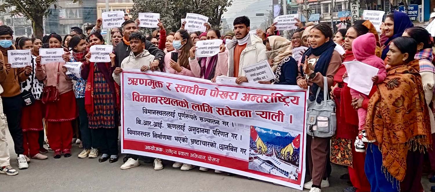 राष्ट्रिय एकता अभियान पोखराले ‘ऋणमुक्त र स्वाधीन पोखरा अन्तर्राष्ट्रिय विमानस्थलको लागि सचेतना र्याली’ निकालेको छ।