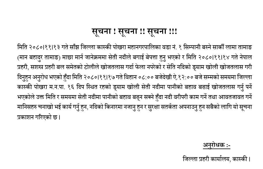 बेपत्ता तामाङको खोजीका लागि ड्याम खोलेर पानीको बहाब बढाउनु पर्ने भएकाले बिहीबार बिहान ८ बजेदेखि १२ बजेसम्म सेती नदीको छेउछाउ नजान तथा सतर्कता अपनाउन प्रहरीले आग्रह गरेको हो ।