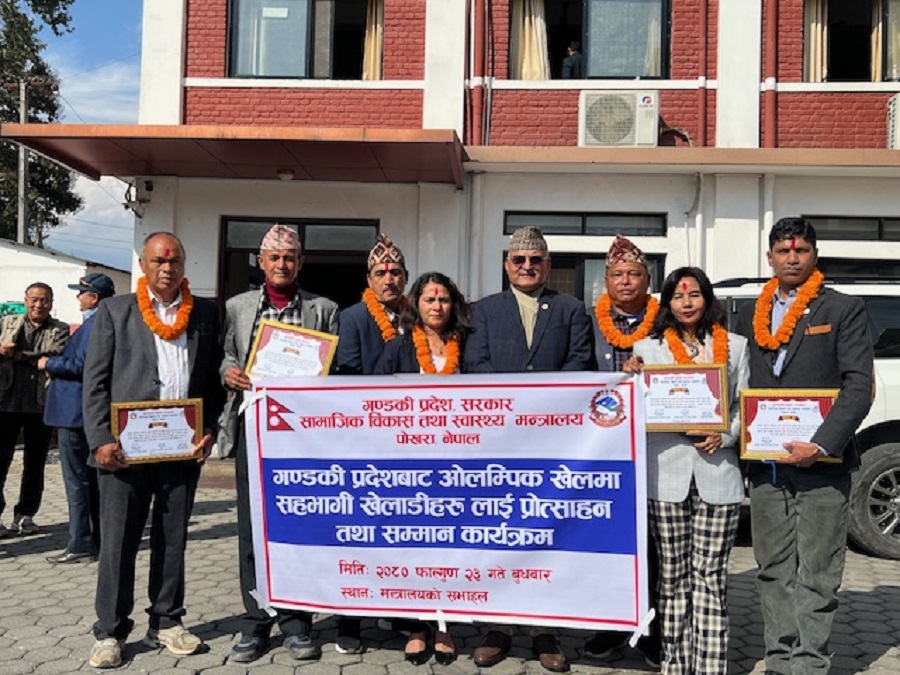 पोखरा । गण्डकी प्रदेशबाट ओलम्पिक खेलमा सहभागी भएका खेलाडीहरुलाई गण्डकी प्रदेश सरकारले सम्मान गरेको छ । मासिक ५ हजार नगद (वार्षिक ६० हजार) सहित आज गण्डकी प्रदेशका मुख्यमन्त्री सुरेन्द्रराज पाण्डेले सम्मान गरेका हुन् ।