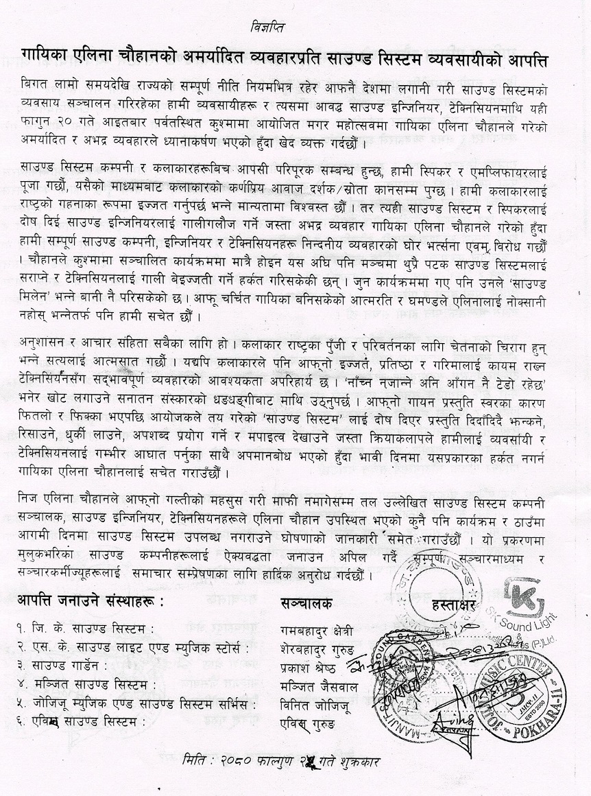 बिगत लामो समयदेखि राज्यको सम्पूर्ण नीति नियमभित्र रहेर आफनै देशमा लगानी गरी साउण्ड सिस्टमको व्यवसाय सञ्चालन गरिरहेका हामी व्यवसायीहरू र त्यसमा आवद्ध साउण्ड इन्जिनियर, टेक्निसियनमाथि यही फागुन २० गते आइतबार पर्वतस्थित कुश्मामा आयोजित मगर महोत्सवमा गायिका एलिना चौहानले गरेको अमर्यादित र अभद्र व्यवहारले ध्यानाकर्षण भएको हुँदा खेद व्यक्त गर्दछौँ ।