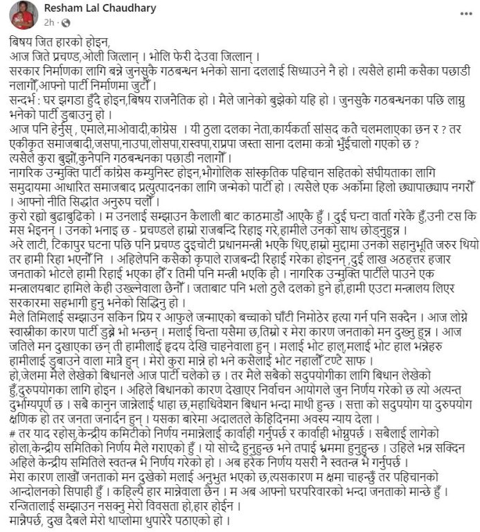 नागरिक उन्मुक्ति पार्टीका संरक्षक रेशमलाल चौधरीले पार्टी अध्यक्ष समेत रहेकी श्रीमती रञ्जिता श्रेष्ठलाई सम्झाउन नसकेको गुनासो गरेका छन्। बुधबार बिहान लामो फेसबुक स्ट्याटस लेखेर अहिलेको परिस्थितिबारे पार्टी अध्यक्ष रहेकी श्रीमती श्रेष्ठलाई सम्झाउन नसकेको बताएका हुन्।
