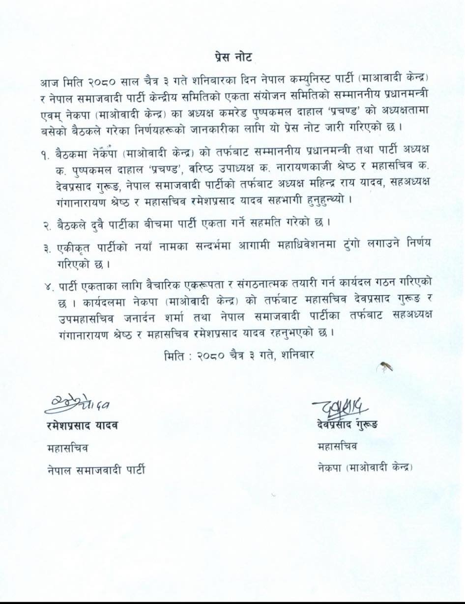 नेपाल कम्युनिस्ट पार्टी (माआवादी केन्द्र) र नेपाल समाजवादी पार्टीबिच पार्टी एकता गर्ने सहमति भएको छ ।