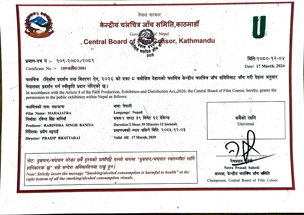 काठमाडौँ । यसवर्षको प्रतिक्षित फिल्म ‘महाजात्रा’ सम्पूर्ण वर्गका दर्शकले हेर्न पाउने भएका छन् ।  केन्द्रीय चलचित्र जाँच समितिले फिल्मलाई हेर्दै ‘यू’ अर्थात् यूनिभर्सल प्रमाणपत्र दिएको छ ।