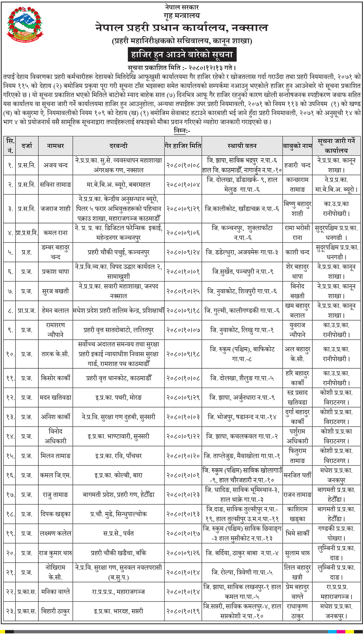 ४ असइसहित २३ प्रहरी सम्पर्कविहीन, सात दिनभित्र हाजिर हुन ताकेता