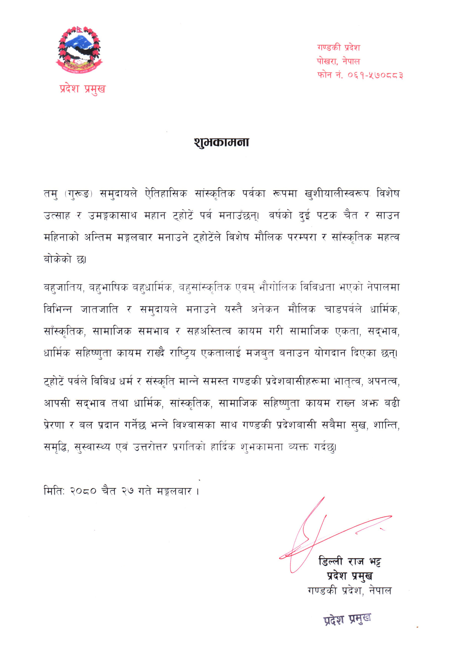 गण्डकी प्रदेश प्रमुख डिल्लीराज भट्टले तमु (गुरुङ) समुदायको महान पर्व ट्होटेंको अवसरमा प्रदेशवासीलाई शुभकामना दिएका छन् ।