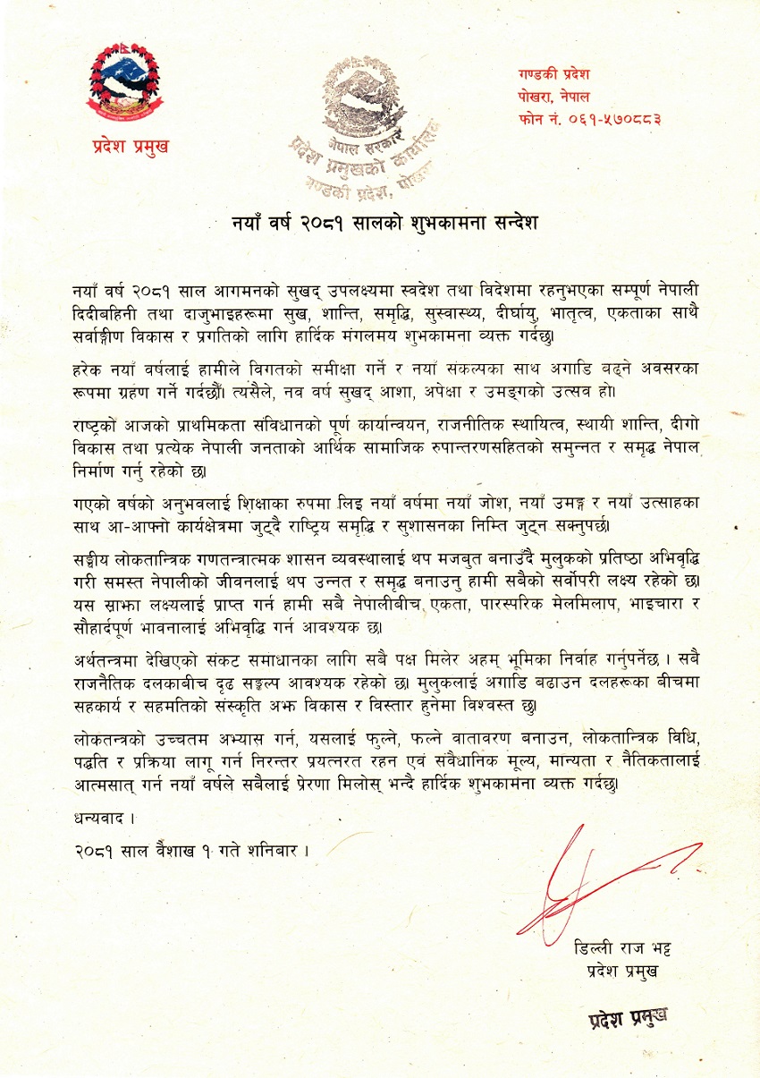 पोखरा । गण्डकी प्रदेशका प्रदेश प्रमुख डिल्लीराज भट्टले नयाँ वर्ष २०८१ साल आगमनको सुखद् उपलक्ष्यमा स्वदेश तथा विदेशमा रहेका सम्पूर्ण नेपालीलाई हार्दिक शुभकामना व्यक्त गरेका छन् ।