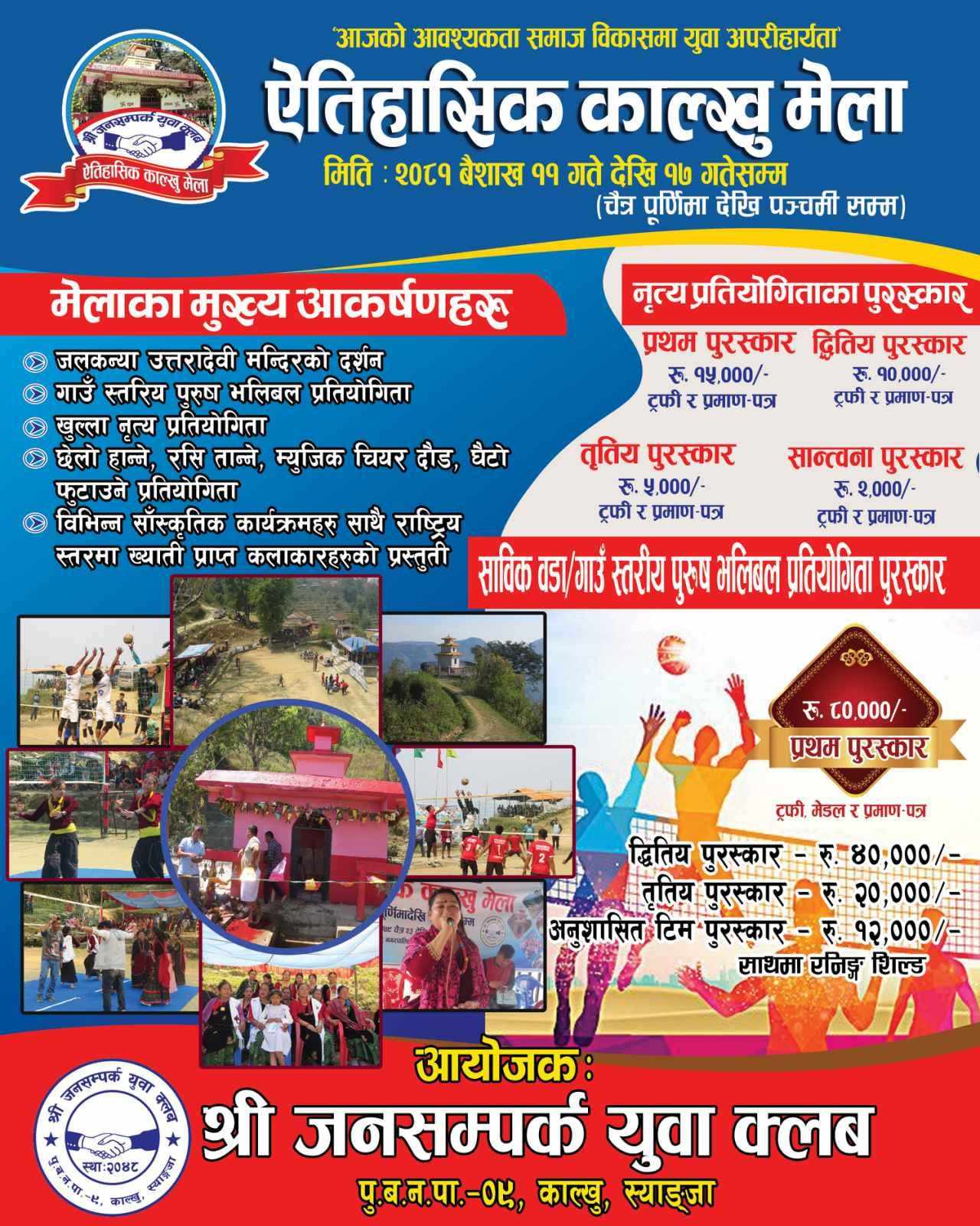 विगत लामो समयदेखि नै चैत्र पूर्णिमाको अवसर पारी चैत्र पूर्णिमादेखि पञ्चमीसम्म संचालन हुँदै आइरहेको ऎतिहासिक काल्खु मेला यस वर्ष पनि हुने भएको हो ।