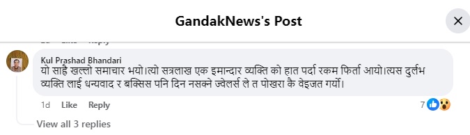 उनले भने – ‘१७ लाख फिर्ता पाएपछि ईनाम दिए वा दिएनन् ? हाम्रो कुरा भएन । हामीले हराएको रकम फेला पारेर सम्बन्धितकहाँ बुझाउने हो । सफल भयौँ ,गर्नुपर्ने यही हो ।’