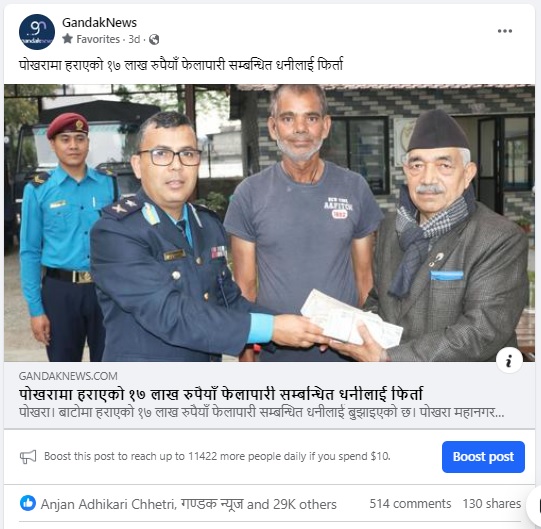 सोही ट्याक्सीमार्फत बसपार्कबाट छोरेपाटन जानेक्रममा शिवराज न्यौपानेको २६ हजार ३ सय रुपैयाँ पैसा र मोबाइल छुटेको थियो । उनले ट्याक्सीमा पैसा र मोबाइल छुटेको पत्तो पाएनन् । तर, पछि खोज्दै जाँदा ट्याक्सी चाकलले इमान्दारिका साथ फिर्ता गरिदिएपछि ३ हजार रुपैयाँ इमान्दारिताको सम्मान गर्दै प्रदान गरेका हुन् ।