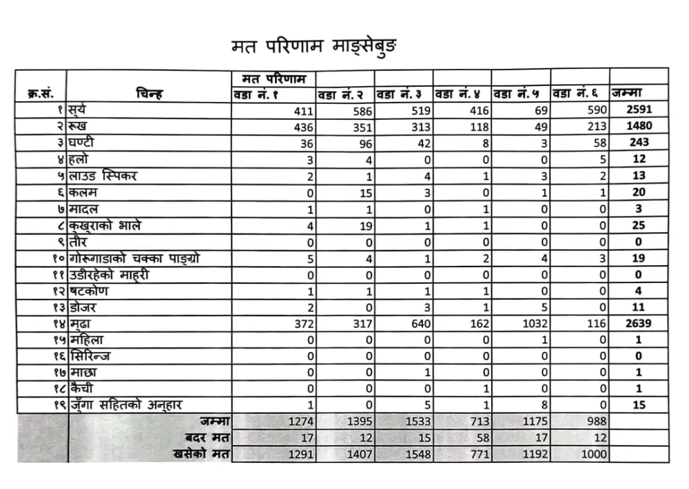 माङ्सेबुङका ६ वटै वडाको मत गणना भइसकेको छ । लिम्बूले माङ्सेबुङ-५, लारुम्बामा सबैभन्दा बढी १०३२ मत प्राप्त गरेका छन् । वडा नम्बर-५ मा लिम्बूपछि एमालेका सुहाङ नेम्बाङले ६९ मत प्राप्त गरेका छन् । त्यस्तै, कांग्रेस उम्मेदवार डम्बरबहादुर खड्काले ४९ मत प्राप्त गर्दा रास्वपाका मिलन लिम्बूले भने उक्त वडामा ३ मत मात्र पाए । माङ्सेबुङमा मिलनले सबैभन्दा बढी आफ्नै वडा नम्बर २ मा ९६ मत मात्र पाएका हुन् । सुहाङले ५८६ मत प्राप्त गर्दा मिलनले सय मत पनि कटाउन सकेनन् ।