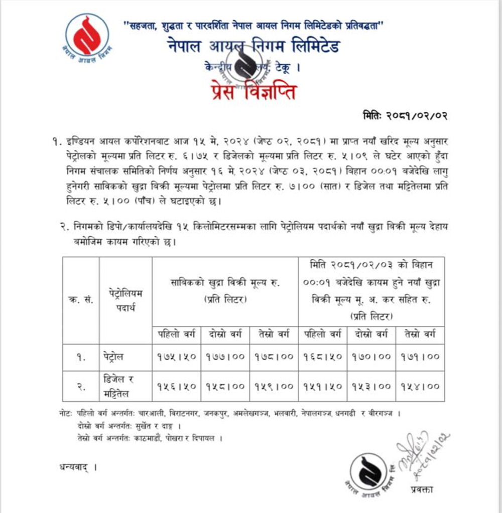 यसअघि पेट्रोल प्रतिलिटर १७८ र डिजेल/मट्टितेल लिटरमा १५९ रुपैयाँ थियो । अब पेट्रोल उपत्यकामा १७१ र डिजेल/मट्टितेल लिटरको १५४ रुपैयाँ पर्ने निगमका प्रवक्ता मनोज ठाकुरद्वारा जारी विज्ञप्तिमा उल्लेख छ ।