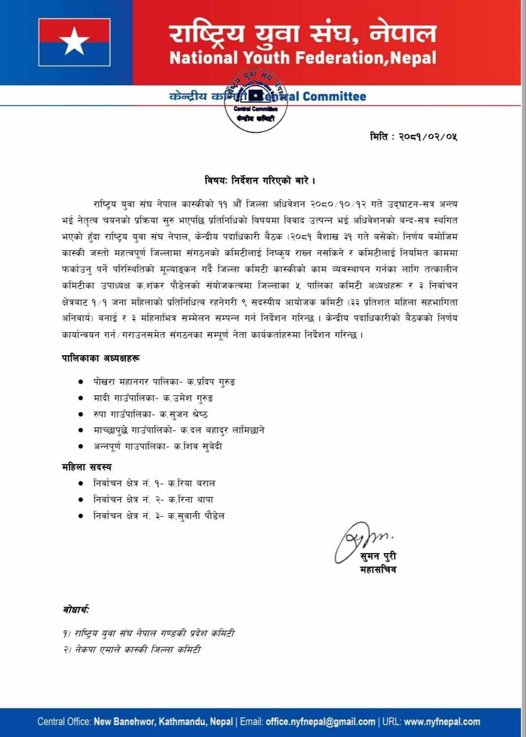 राष्ट्रिय युवा संघ नेपाल, केन्द्रीय पदाधिकारी बैठक २०८१ वैशाख ३१ गते सोमबार बसेको बैठकले निर्णय बमोजिम कास्की जस्तो महत्वपूर्ण जिल्लामा संगठनको कमिटीलाई निष्कृय राख्न नसकिने र कमिटीलाई नियमित काममा फर्काउनु पर्ने परिस्थितिको मूल्याङ्कन गर्दै जिल्ला कमिटी कास्कीको काम व्यवस्थापन गर्नका लागि तत्कालीन कमिटीका उपाध्यक्ष शंकर पौडेलको संयोजकत्वमा जिल्लाका ५ पालिका कमिटी अध्यक्षहरू सहित ३ निर्वाचन क्षेत्रवाट १/१ जना महिलाको ३३ प्रतिशत महिला सहभागिता अनिवार्य बनाई प्रतिनिधित्व रहने गरी ९ सदस्यीय आयोजक कमिटी बनेको छ ।
