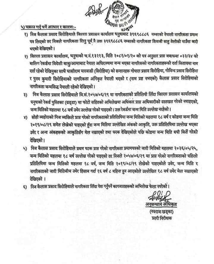 कैलाश प्रसाद सिरोहियाले वि.सं. २०५७–०६–२९ मा नागरिकताको प्रतिलिपी लिँदा जिल्ला प्रशासन कार्यालयको धनुषाको रेकर्ड पुस्तिका मा फोटो सहितको अभिलेखमा अधिकार प्राप्त अधिकारीको दस्तखत गरेको नपाइएको, जन्म मितिको महलमा १८ वर्ष उमेर उल्लेख गरेको पाइएको उक्त रेकर्डमा जन्म मिति उल्लेख नरहेको देखिएको पनि कार्यालयले उल्लेख छ।