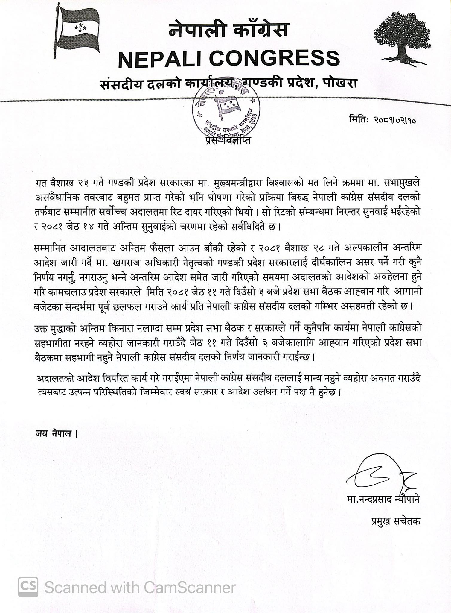 ‘अदालत अन्तिम फैसला आउन बाँकी रहेको र २०८१ वैशाख २८ गते अल्पकालीन अन्तरिम आदेश जारी गर्दै खगराज अधिकारी नेतृत्वको गण्डकी सरकारलाई दीर्घकालिन असर पर्ने गरी कुनै निर्णय नगर्नु, नगराउनु भन्ने अन्तरिम आदेश समेत जारी गरिएको समयमा अदालतको आदेशको अवहेलना हुने गरी कामचलाउ सरकारले मिति २०८१ जेठ ११ गते अपराह्न ३ बजे प्रदेश सभा बैठक आह्वान गरेर आगामी बजेटका सन्दर्भमा पूर्व छलफल गराउने कार्यप्रति नेपाली कांग्रेस संसदीय दलको गम्भिर असहमति रहेको छ,’ कांग्रेस प्रमुख सचेतक नन्दप्रसाद न्यौपानेले बिहीबार जारी गरेको विज्ञप्तिमा उल्लेख छ।