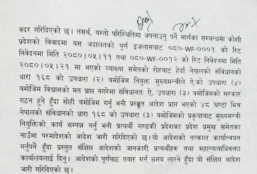 तीन वर्षअघि शेरवहादुर देउवालाई प्रधानमन्त्री नियुक्तिको लागि दिएको परमादेशकै शैलीमा समय तोकेर गण्डकीको मुख्यमन्त्री नियुक्त गर्न परमादेश जारी गरेको हो ।