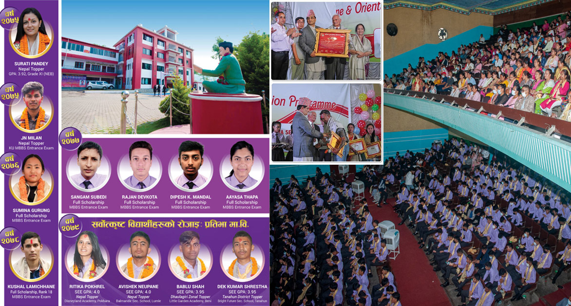 उचित परामर्श नपाउँदा कतिपय विद्यार्थी अन्योलतामै बाबजुत अध्ययन थाल्न बाध्य हुन्छन्, त्यसका पर्याप्त उदाहरण भेट्न सकिन्छ । तर यिनै विद्यालयको भीडमा उभिएको एउटा शिक्षण संस्था हो–प्रतिभा मावि, जसले विद्यार्थीलाई सुरूदेखि अन्तिमसम्म साथ लिएर हिँड्छ, सही विषय र क्षेत्र छनोट गर्न सुझाउँछ, विद्यार्थीको रूचिअनुसार गन्तव्यमा पुग्न ‘ब्याकबोन’ बनिदिन्छ । त्यसैले त पोखराको पालिखेचोकस्थित प्रतिभा माविले भन्न पाएको छ–पोखरामा सबैभन्दा धेरै र सर्वाेत्कृष्ट विद्यार्थीको रोजाइ, पोखराको शैक्षिक सान–प्रतिभा मावि ।