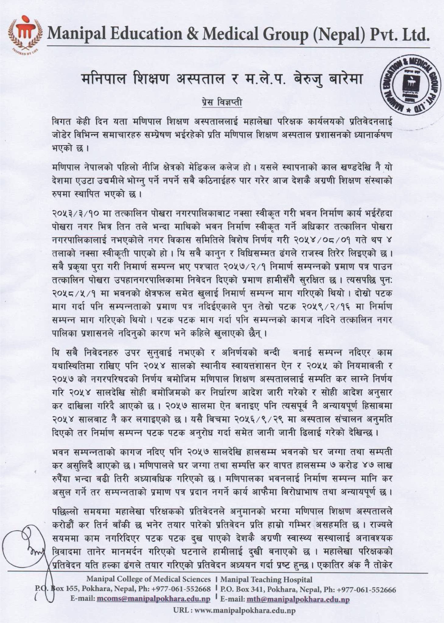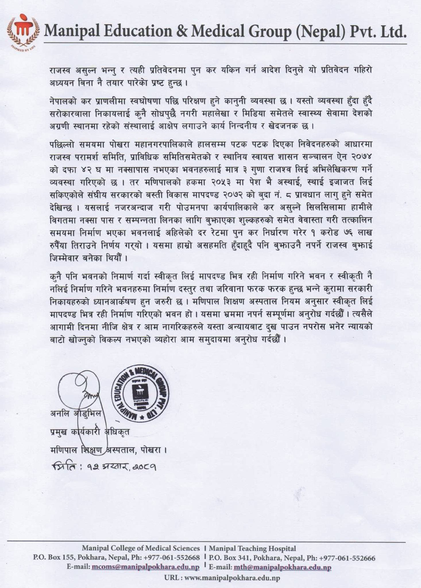 मणिपालका प्रमुख कार्यकारी अधिकृत अनिल ओडुभिलले बुधबार एक विज्ञप्ति जारी गर्दै पोखरा महानगरपालिकाले २२ वर्ष अघि नै भवन सम्पन्न प्रमाणपत्र दिनुपर्नेमा कर असुल गरेको तर सम्पन्न प्रमाणपत्र भने नदिएको जनाएका छन् ।