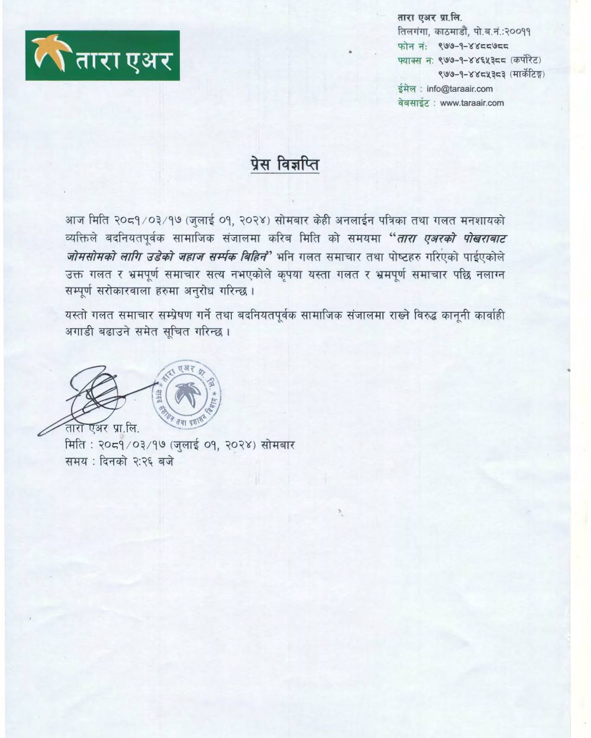 उता, नागरिक उड्ययन प्राधिकरण पोखरा कार्यालयले पनि तारा एयरको जहाज सम्पर्कविहीन भएको भन्ने खबरलाई अफवाहको संज्ञा दिएको छ ।