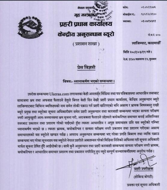 सिआईबीका प्रवक्ता एवं सूचना अधिकारी प्रहरी उपरीक्षक होबिन्द्र बोगटीले हस्ताक्षर गरेको ध्यानाकर्षण पत्रमा भनिएको छ–‘उपरोक्त सम्बन्धमा केही अनलाईन मिडिया तथा पत्र पत्रिकाहरुमा आधारहिन तवरबाट सामाजमा भ्रम तथा अफवाह फैलाउने हेतुले बिगत केही दिनदेखि प्रहरी प्रधान कार्यालय, केन्द्रिय अनुसन्धान ब्यूरो लाजिम्पाटबाट बिभिन्न ब्यक्तिहरुको नाम समेत तोकी पक्राउ गर्न प्रहरी खटिगएको भनि असत्य र भ्रामक बिषयबस्तु राखी ब्यूरो प्रमुख तथा ब्यूरोका सूचना अधिकारीसंग समेत प्रहरी अनुसन्धान तथा कारवाही सम्बन्धमा भएका सत्यता परीक्षण नगरी आफुखुशी आम–जनमानसमा भ्रम सृजना गरी, अराजकता फैलाउने उद्देश्यले कपोकल्पित समाचार बनाई अतिरञ्जित तवरबाट प्रकाशन तथा प्रशारण गरेको पाईएको हुँदा त्यस्ता आधारहिन र अपुष्ट समाचाहरु प्रति यस ब्यूरोको गम्भिर ध्यानाकर्षण भएको छ ।’