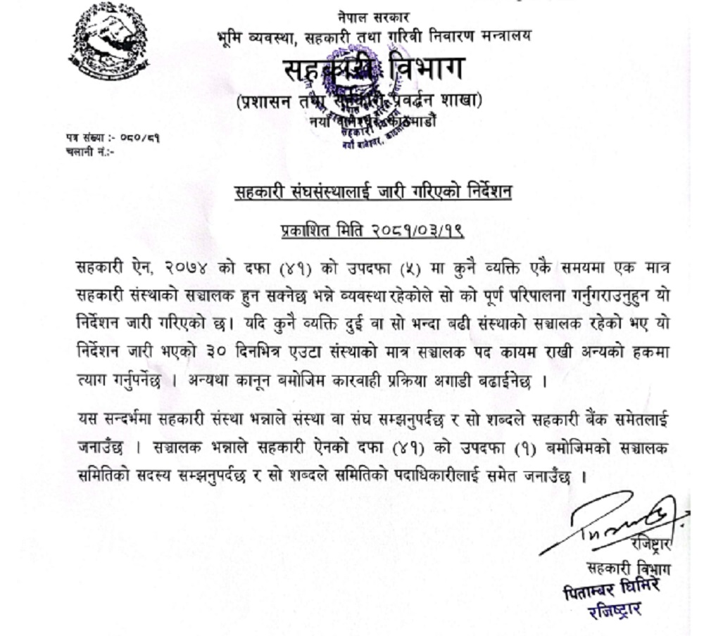 विभागले एक सूचना जारी गर्दै एकै प्रकृतिका एकभन्दा बढी सहकारी संस्थाहरूको सदस्यता लिएको भए कुनै एकमात्र सहकारी संस्थाको सदस्यता कायम राखी अन्य सहकारी संस्थाको सदस्यता अन्त्य गर्न भनेको छ ।