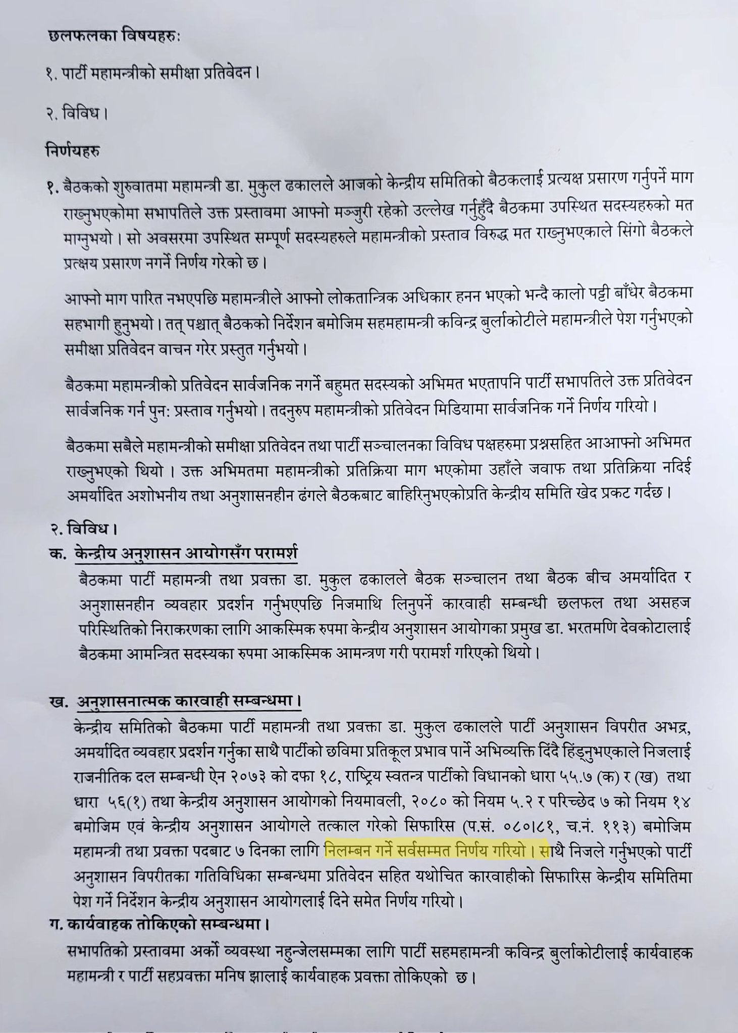 “केन्द्रीय समितिको बैठकमा उहाँले पार्टीको अनुशासनविपरीत अभद्र, अमर्यादित व्यवहार प्रस्तुत गर्नुका साथै पार्टीको छवि प्रतिकूल पार्ने अभिव्यक्ति दिँदै हिँड्नुभएकाले उहाँलाई निलम्बन गर्ने निर्णय गरिएको हो”, केन्द्रीय सदस्य सोविता गौतमले भनिन्, “तत्काललाई पार्टी सहमहामन्त्री कविन्द्र बुर्लाकोटीलाई कार्यवाहक महामन्त्री र सहप्रवत्ता मनिष झालाई कार्यवाहक प्रवक्ता तोकिएको छ ।”
