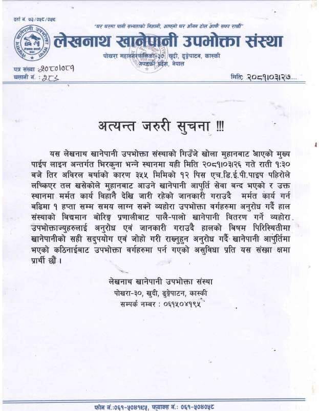 गण्डकी प्रदेशको अग्रणी अनलाइन गण्डक न्यूज विभिन्न प्लाटफर्ममा उपलब्ध छन्। सामाजिक सञ्जालहरूमा हाम्रो च्यानल सब्स्क्राइब गर्न यहाँ क्लिक गर्नुहोस्। जहाँ तपाईँ फेसबुक, ट्विटर, इन्स्टाग्राम, यूट्युब लगायतमा पनि हाम्रा सामाग्री हेर्न सक्नुहुन्छ। नयाँ खबर थाहा पाउनका लागि गण्डक न्यूज र हाम्रो अर्को आधिकारिक वेबसाइट गण्डकी न्यूज भिजिट गर्दै गर्नुहोला। साथै, माथि समाचार पढेपछि तपाईँको प्रतिक्रिया के छ? व्यक्त गर्नुहोला।