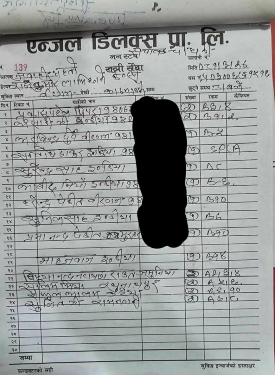 कलङ्कीस्थित गणपति ट्राभल्स बस काउन्टरले दिएको जानकारी अनुसार काठमाडौंबाट रौतहटका लागि २७ जना यात्रुले टिकट काटेर बस चढेका थिए। बस काउन्टरले उपलब्ध गराएको चलानी नम्बरमा बस चढेकाहरूको ठेगाना, मोबाइल नम्बर र नाम खुलाइएको छ भने थर उल्लेख गरिएको छैन।