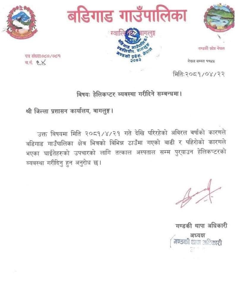 घटनास्थलमा प्रहरी पुग्न नसकेकाले घटनाको पूर्ण विवरण आउन अझै बाँकी छ । घाइतेको उपचारका लागि हेलिकप्टरको व्यवस्थापन गर्ने तयारी भैरहेको छ । बडीगाड गाउँपालिका अध्यक्ष गण्डकी थापा अधिकारीले पहिरोमा परी घाइते भएकाहरुको प्राथमिक उपचारको व्यवस्थापन पालिका मार्फत भएको र केहि समयपछि उपचारको लागि हेलिकप्टर मार्फत काठमाडौं लगिने बताएकी छन् ।