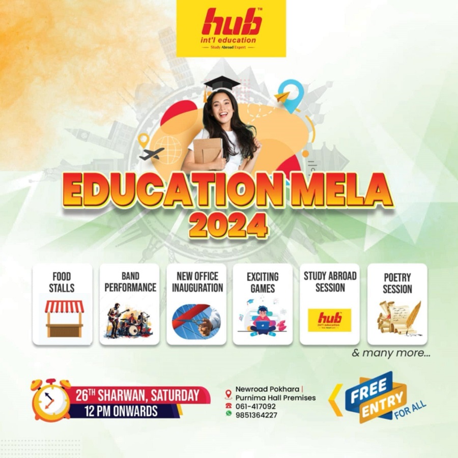 पोखरा । पोखरामा शनिबार हब शैक्षिक मेला हुने भएको छ । हब इन्टरनेशनल एजुकेशन पोखराको आयोजनामा न्यूरोडस्थित पूर्णिमा कम्प्लेक्समा शनिबार शैक्षिक मेला हुन लागेको हो ।