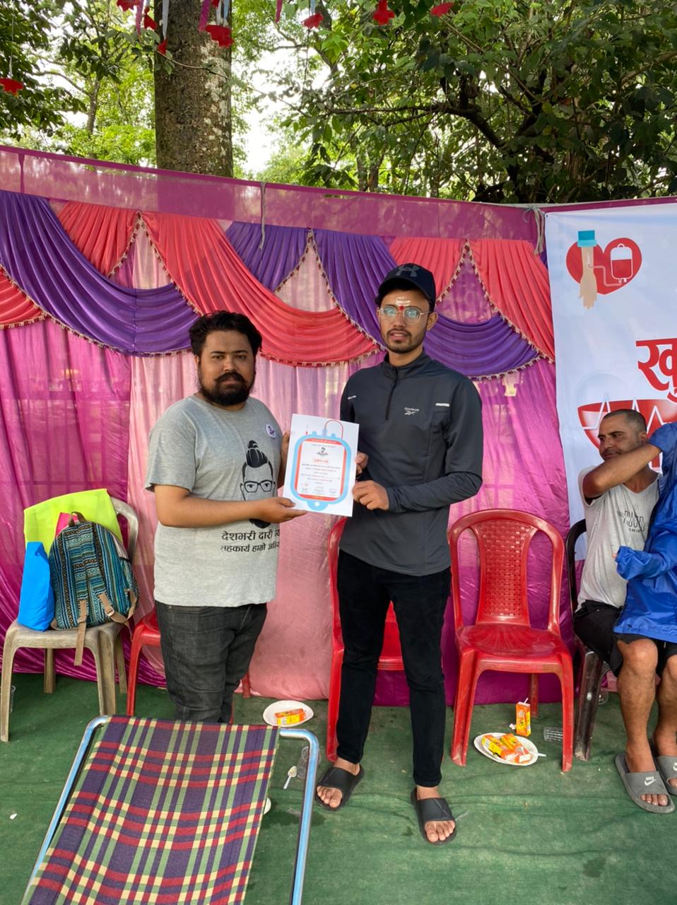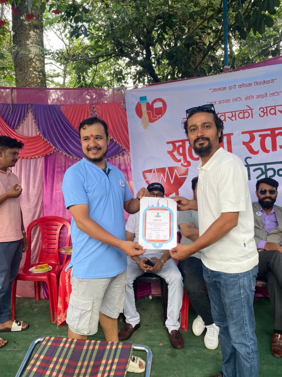 पोखराको केदारेश्वर मन्दिर परिसरमा आयोजित कार्यक्रममा प्रमुख आमन्त्रित व्यक्तित्व एवं संस्थापक अध्यक्ष शेखर गौतमलाई ब्लड ब्याग हस्तान्तरण गर्दै रक्तदान कार्यक्रमको शुभारम्भ भएको संयोजक उज्ज्वल भुजेलले बताए ।