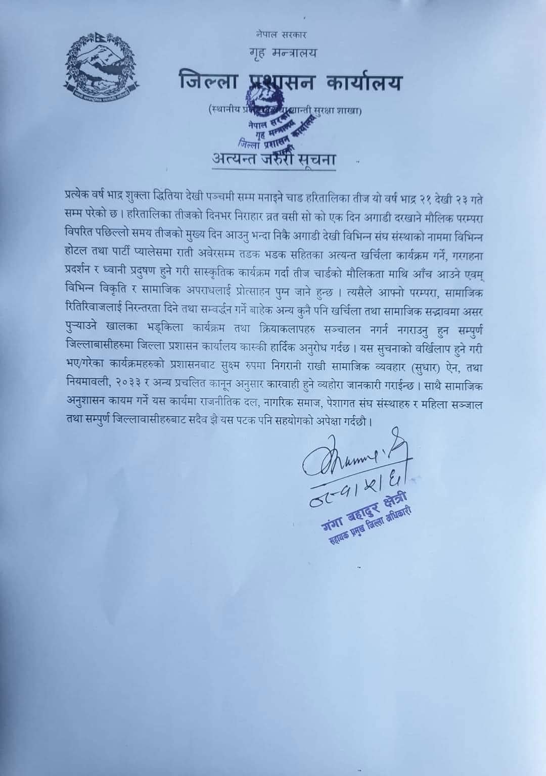 जिल्ला प्रशासन कार्यालय कास्कीले बिहीबार सूचना जारी गर्दै तीजका नाममा होटल तथा पार्टी प्यालेसमा राति अबेरसम्म तडकभडकसहितका अत्यन्त खर्चिला कार्यक्रम गर्न नपाइने भनेको छ ।