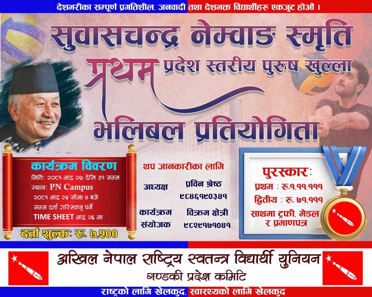 नेपाली राजनीतिका शीर्षस्थ व्यक्तित्व स्वर्गीय सुवास चन्द्र नेम्वाङको स्मृतिमा नेकपा एमालेको विद्यार्थी संगठन अखिल नेपाल स्वतन्त्र विद्यार्थी युनियन (अनेरास्ववियु), गण्डकी प्रदेश कमिटिले प्रथम प्रदेश स्तरीय पुरुष खुल्ला भलिबल प्रतियोगिता गर्ने भएको छ ।