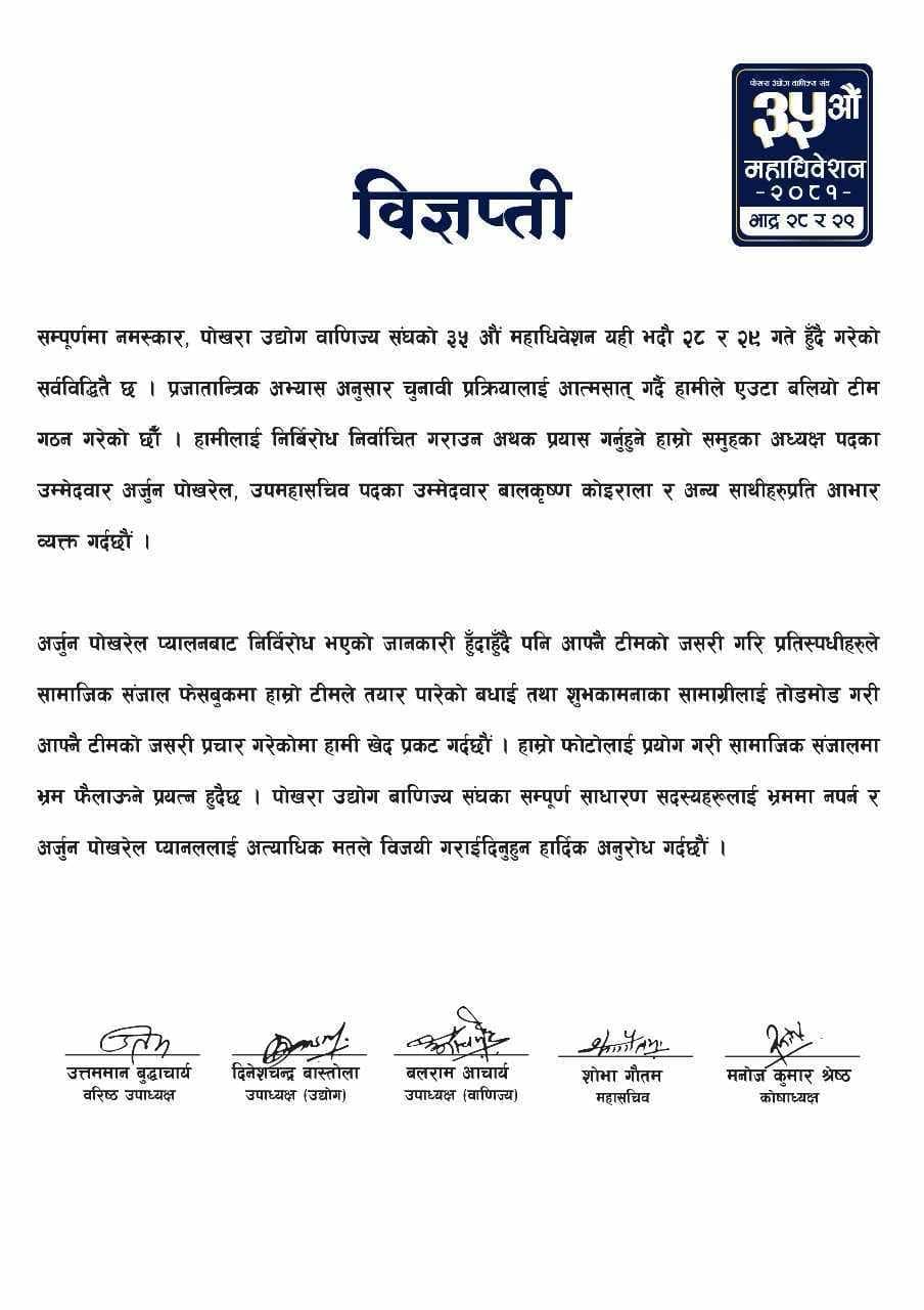 निर्विरोध भएका ५ पदाधिकारीले हाम्रो फोटोलाई प्रयोग गरी सामाजिक संजालमा भ्रम फैलाउने प्रयत्न भईरहेको र भ्रममा नपर्न सम्पूर्ण साधारण सदस्यलाई आग्रह गरेका छन् । अर्जुन पोखरेल प्यानललाई अत्याधिक मतले विजयी गराउन उनीहरुको अनुरोध छ । आफुहरु निर्विरोध भए पनि टीम प्रति बफादार र प्रतिबद्ध रहेको उनीहरुको भनाई छ ।
