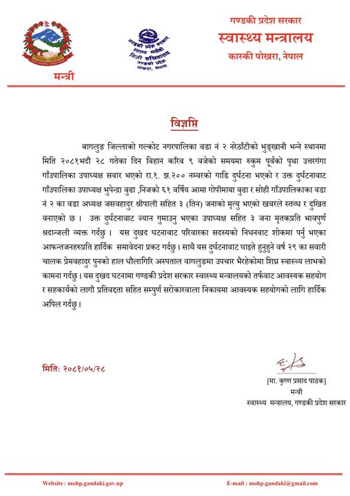 उनले यस दुःखद घटनामा गण्डकी प्रदेश सरकार स्वास्थ्य मन्त्रालयको तर्फवाट आवस्यक सहयोग र सहकार्यको लागी प्रतिवद्दतासहित सम्पूर्ण सरोकारवाला निकायमा आवश्यक सहयोगको लागि अपिल पनि गरेका छन् ।