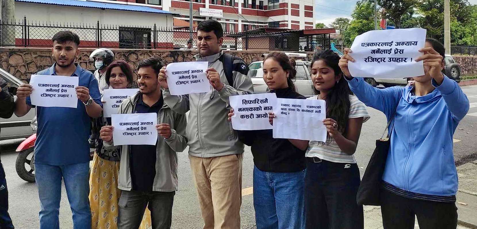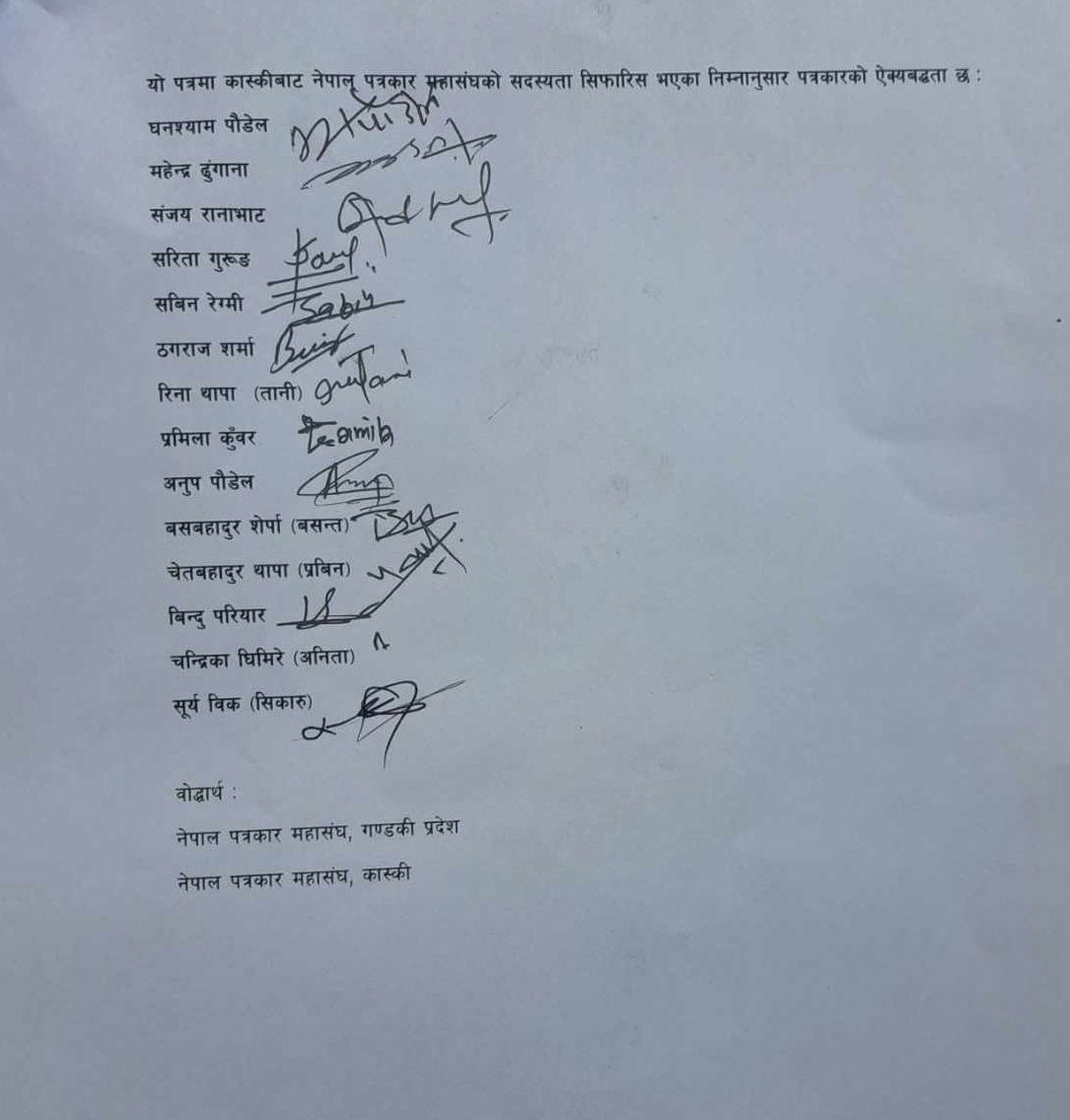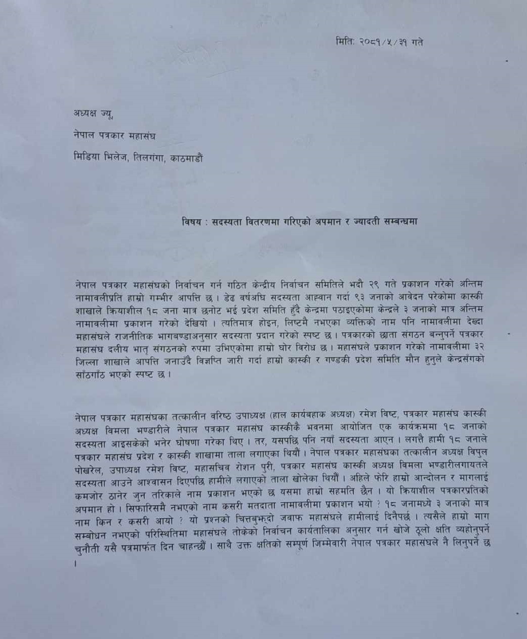‘पत्रकारको छाता संगठन बन्नुपर्नेमा पत्रकार महासंघ दलीय भातृ संगठनको रुपमा उभिएकोमा हाम्रो घोर विरोध छ । महासंघले प्रकाशन गरेको नामावलीमा ३२ जिल्ला शाखाले आपत्ति जनाउँदै विज्ञप्ति जारी गर्दा हाम्रो कास्की र गण्डकी प्रदेश शाखा मौन हुनुले केन्द्रसँगको साँठगाँठ भएको स्पष्ट छ,’ समूहले जारी गरेको पत्रमा उल्लेख छ ।
