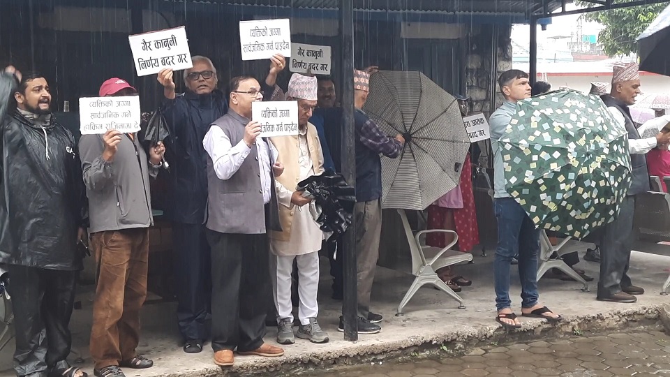 शुरुमा विरोध पत्र बुझाएका उनीहरुले झरीका बाबजुद ‘व्यक्तिको नामको जग्गा सरकारी बनाउन पाईंदैन, गैरकानूनी निर्णय खारेज गर, मालपोत प्रमुख मुर्दावाद, पीडित पराजुली परिवारलाई न्याय दे’लगायतका नाराहरु लगाउँदै प्रदर्शन गरेका हुन् ।
