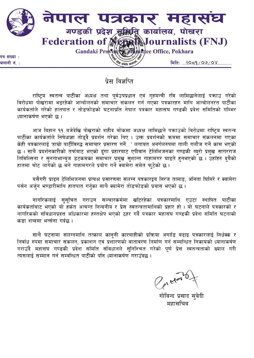 पाेखरामा रास्वपा कार्यकर्ताबाट पत्रकारमाथि आक्रमण भएकाेमा पत्रकार संघसंगठनकाे आपत्ति