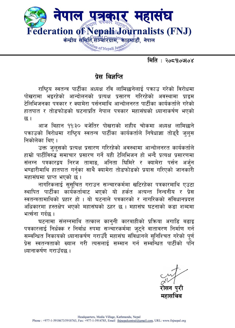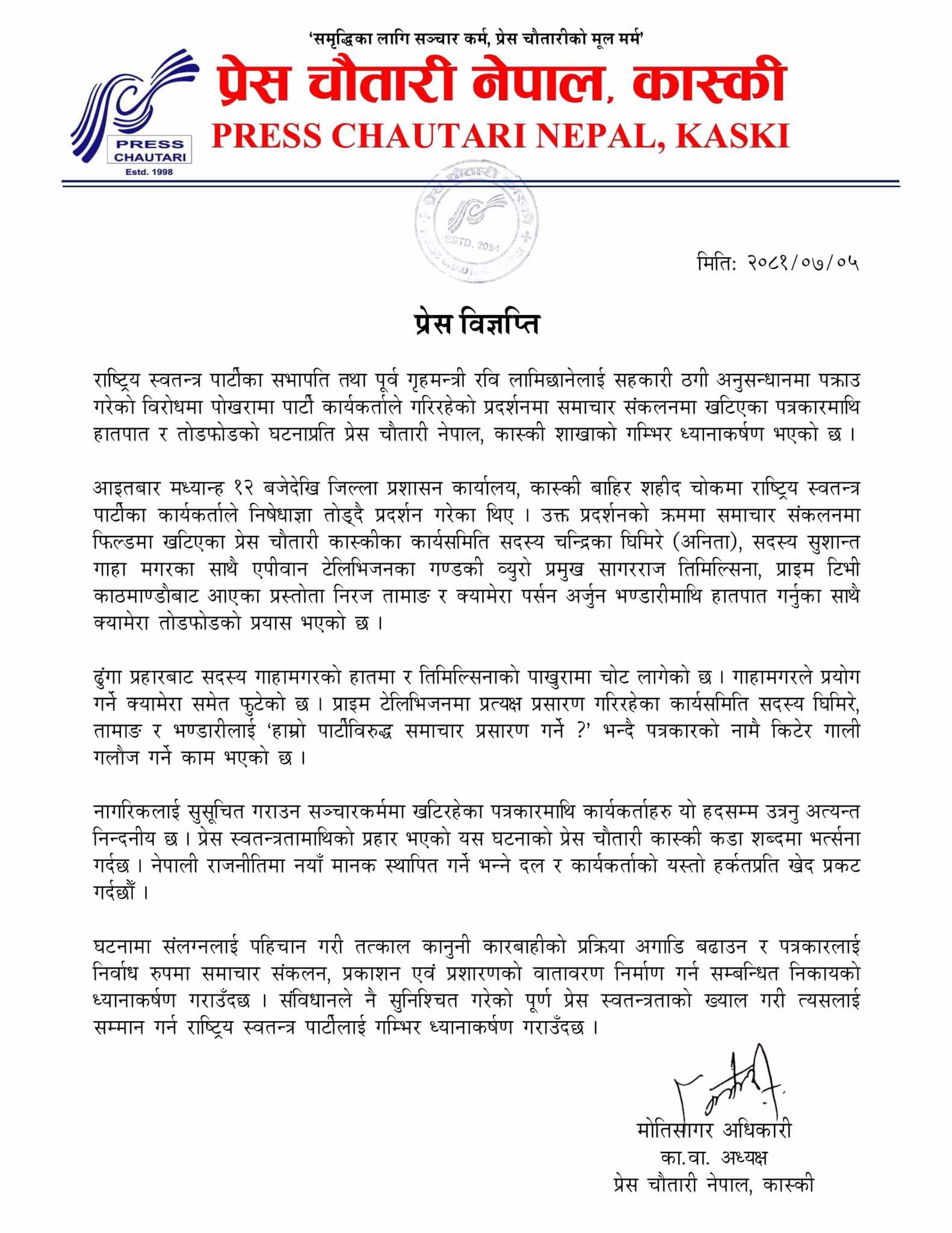 आइतबार मध्यान्ह १२ बजेदेखि पोखराको शहीद चोकमा पार्टी सभापति रवि लामिछाने पक्राउको विरोधमा कार्यकर्ताले निषेधाज्ञा तोड्दै प्रदर्शन गरेकामा समाचार संकलनका लागि गएका पत्रकारलाई ‘हाम्रो पार्टीविरुद्ध समाचार प्रसारण गर्ने…..’ लगायतका अनर्गल गाली गलौज पनि गरेका थिए ।
