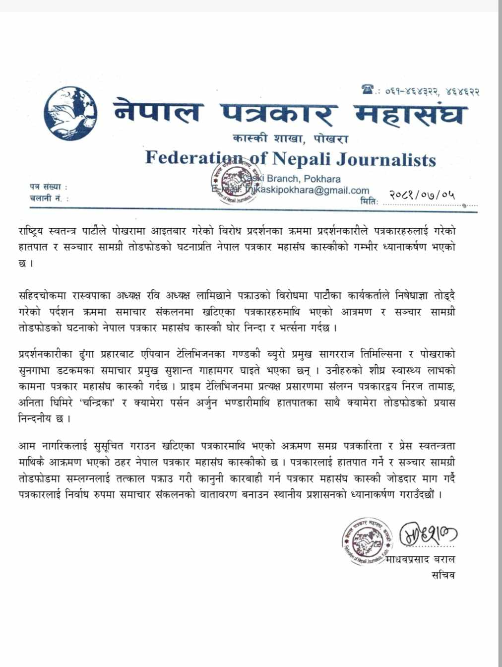 उक्त घटनाप्रति नेपाल पत्रकार महासंघ केन्द्रीय समिति,  गण्डकी प्रदेश समिति, कास्की शाखा र प्रेस चौतारी नेपाल, कास्की शाखाले गम्भीर ध्यानाकर्षण भएको जनाउँदै पत्रकारमाथि भएको हर्कत अत्यन्त निन्दनीय र प्रेस स्वतन्त्रतामाथिको प्रहार भएको बताएको छ । यो घटनाले पत्रकार र नागरिकको संविधानप्रदत्त अधिकारमासमेत हस्तक्षेप भएको ठहर गर्दै महासंघले कडा शब्दमा भर्त्सना गरेको छ ।
